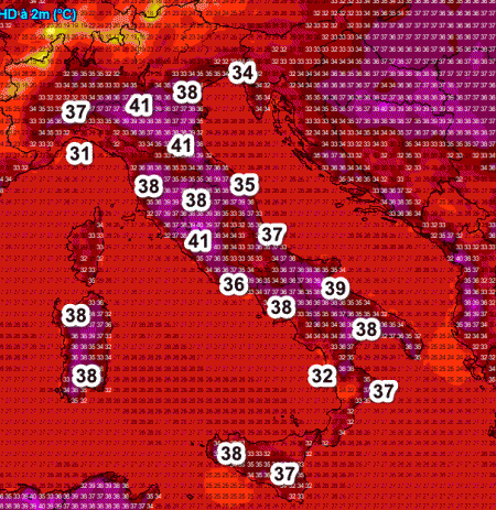 Massima attenzione all’Emilia Romagna, alla bassa Toscana e al Lazio che potrebbero raggiungere la ragguardevole cifra di 41°. Osservate quanti valori previsti fino a 37-39°, anche sulle regioni meridionali e il versante adriatico.