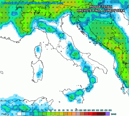 Gli accumuli di pioggia totali previsti dal modello matematico GFS fino ad inizio prossima settimana mostrano una chiara concentrazione dei fenomeni al nord e nelle zone interne/montuose: