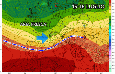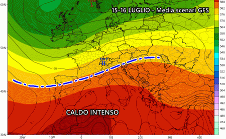 Ma fortunatamente le simulazioni modellistiche ci vengono incontro con scenari quantomeno confortanti. Per l’esattezza il modello americano GFS propone uno sblocco della situazione a metà Luglio, grazie all’avanzata di un fronte fresco nord-atlantico dapprima sull’Europa centrale e a seguire sul nord Italia.