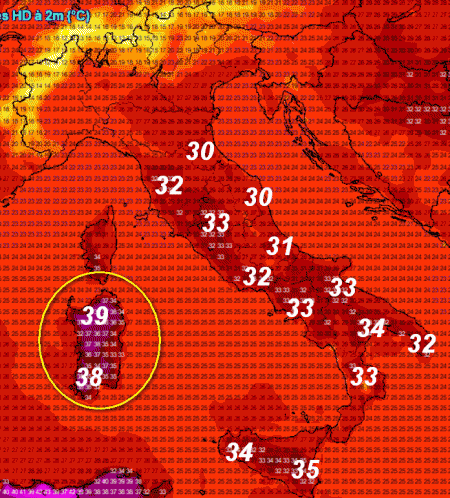 La Sardegna andrà letteralmente "a fuoco" con punte diffuse di 38-39°, senza disdegnare i 40° su alcune aree. Valori molto elevati si avranno anche al sud, con punte di 35° in Sicilia e 34° sulla bassa Lucania. Il centro Italia avrà temperature comprese tra 30 e 33°, mentre al nord avremo valori nettamente più gentili anche se sempre esuberanti (e di molto) dalla media del periodo.