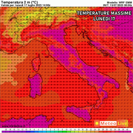 Lunedì 17 il caldo accelera su tutta Italia. Punte di 41-42°C nelle zone interne del sud e delle isole. FIno a 37-38°C al nord, specie su Val Padana orientale.