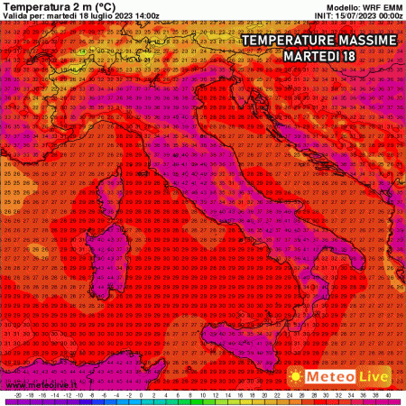 Martedì 18 ulteriore intensificazione del caldo. Picchi di 40°C in Emilia Romagna, 40-41°C nelle zone interne del centro e al sud. Spuntano valori estremi di 44-45°C in Sardegna.