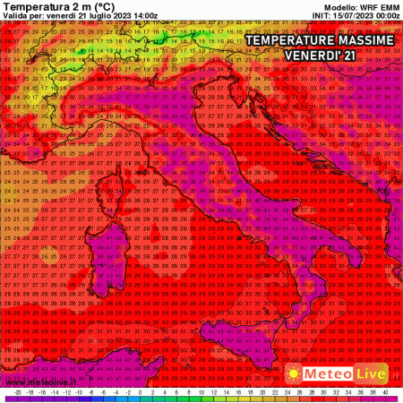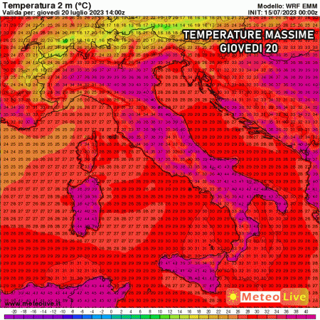 Giovedì 20 possibile un leggero calo delle temperature al nord, le quali però resteranno su valori esagerati. Caldo eccezionale in Puglia dove emergono picchi di 44-45°C nel foggiano.