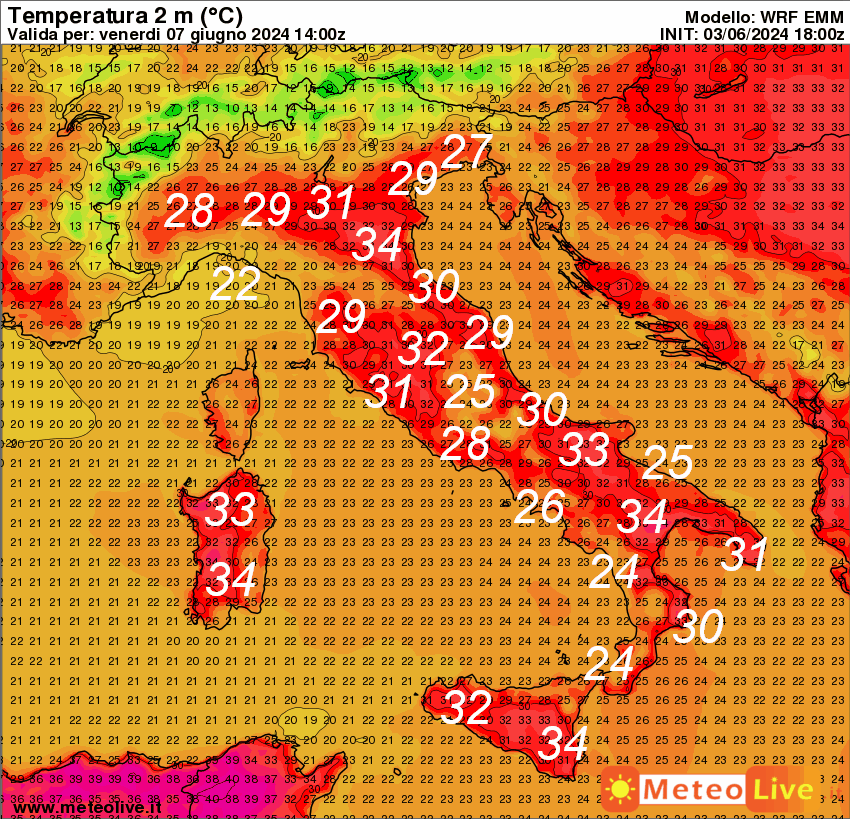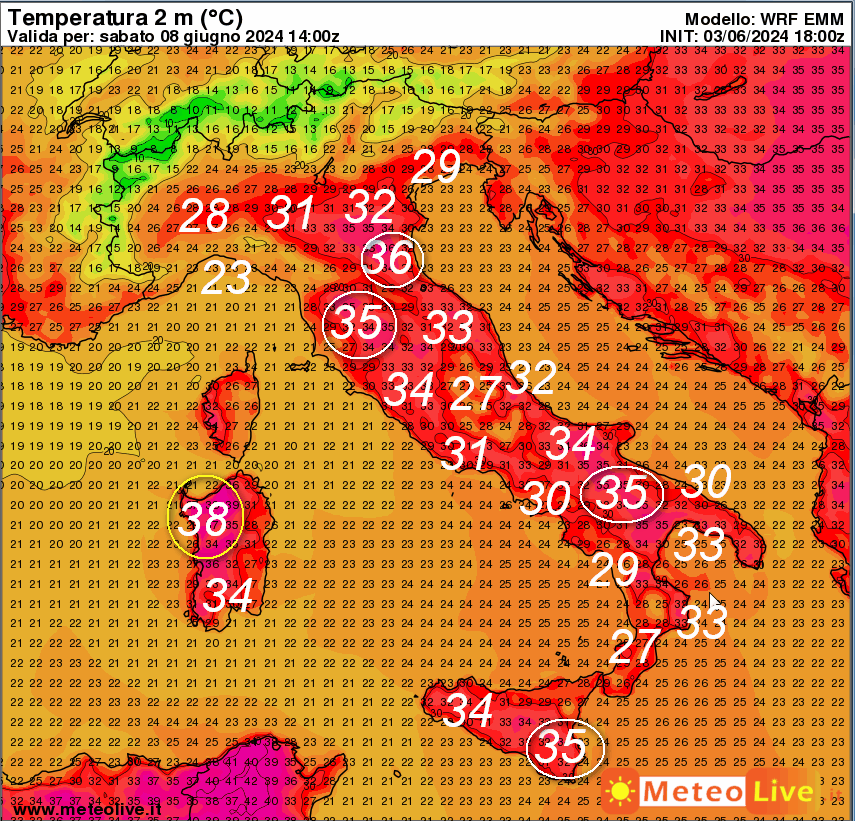 La giornata peggiore per il caldo, come anticipato, sarà sabato 8 giugno. Queste sono le temperature attese al suolo alle ore 16 della giornata in parola: