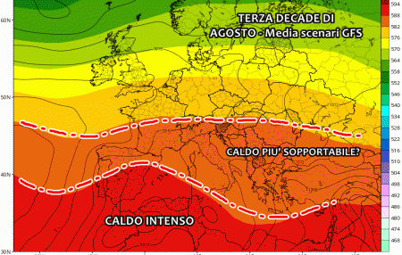 Da valutare la resistenza di questa avvezione calda nel corso della terza decade del mese. La media degli scenari di GFS propone un lento decadimento che riporterebbe le temperature verso valori sopportabili.