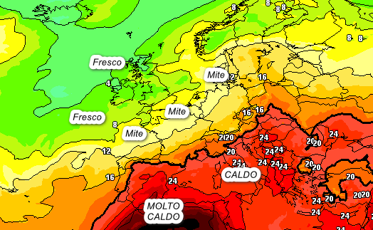 La “fornace africana” sarà a pieno regime ed invierà il suo bollente messaggio verso le nostre regioni, in modo particolare al centro e al sud. Il fresco flusso atlantico si alzerà di latitudine andando ad interessare solo le Isole Britanniche. Dalla mappa si notano isoterme attorno a + 24° a 1500 metri su parte del centro-sud e sulla Sicilia occidentale, mentre al nord avremo temperature alla medesima quota di poco inferiori a 20°.
