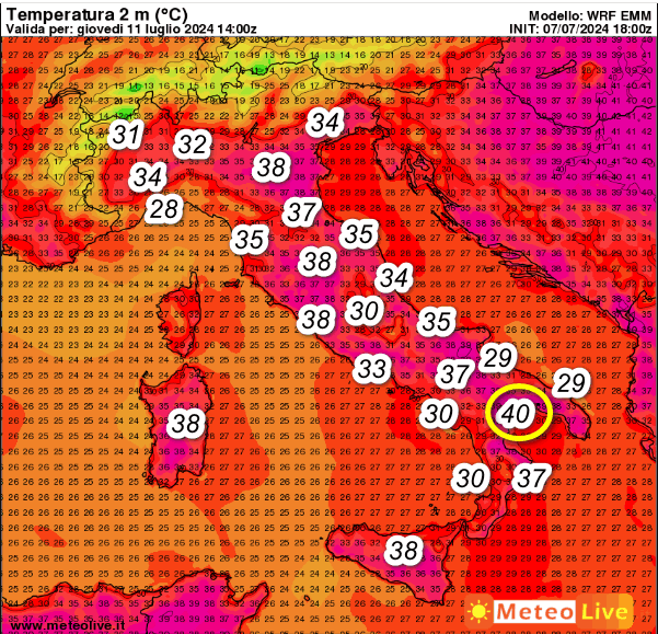 Al nord punte di 37-38° tra Emilia Romagna e basso Veneto. Al centro si prevedono 38° sulla Sardegna e nelle aree interne di Toscana e Lazio; al sud 40° sulla bassa Lucania, 38° in Sicilia e 37° sulla Calabria Ionica. A questi valori termici si aggiungerà anche un DISAGIO da CALDO molto elevato.