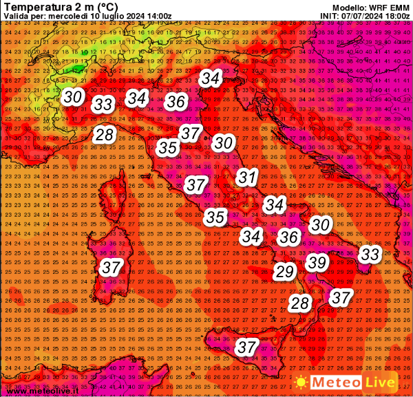 Al nord ritroveremo punte di 36-37° sull’Emilia Romagna e il basso Veneto. Al centro 37° sulla Sardegna e nelle aree interne tosco-laziali; al sud punte di 39° sulla bassa Lucania, 37° in Sicilia e sulla Calabria Ionica, 36° nel Foggiano in Puglia.