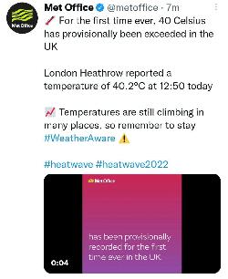 E’ stato il Met Office (servizio meteorologico nazionale del Regno Unito) a comunicare attraverso un tweet che la località di Londra Heathrow ha raggiunto alle ore 12:50 il valore di 40,2°C. Si tratta della temperatura più alta mai registrata a Londra e in tutta l’Inghilterra.