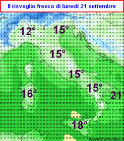 La diminuzione delle temperature risulterà apprezzabile soprattutto nella notte su lunedi 21 quando su tutto il centro-nord si scenderà sotto i 20°C e su molte zone anche sotto i 15°C.