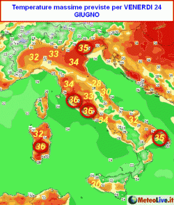 La prima cartina ci mostra il quadro termico previsto per venerdì 24 giugno sul Bel Paese.