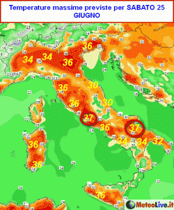 Di seguito, nella seconda mappa, le temperature attese per sabato 25 giugno, nel pomeriggio.