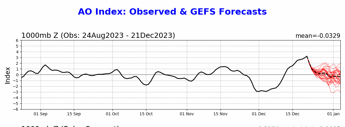 L’indebolimento del vortice polare sembra essere molto probabile sul finire di dicembre, dopo la breve ripresa arrivata a metà mese. L’indice AO (Artic Oscillation) mostra un deciso calo della curva fino a sfiorare il territorio negativo. Questo significa che la pressione tenderà ad aumentare alle latitudini polari, mentre le ondate di freddo diverrebbero più frequenti alle basse latitudini.