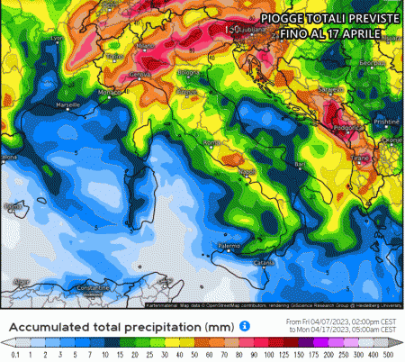Dalla mappa delle precipitazioni totali previste fino a domenica 17 Aprile, possiamo riscontrare una concentrazione notevole di accumuli importanti sul nord Italia. In rosso sono indicate le aree con oltre 100 mm di pioggia previsti entro il 17 Aprile. Decisamente si tratta delle previsioni più redditizie per il nord da diversi mesi a questa parte, ma saranno necessari altri aggiornamenti per confermare questa traiettoria delle perturbazioni, anche perchè la media degli scenari al momento è molto meno ottimistica.