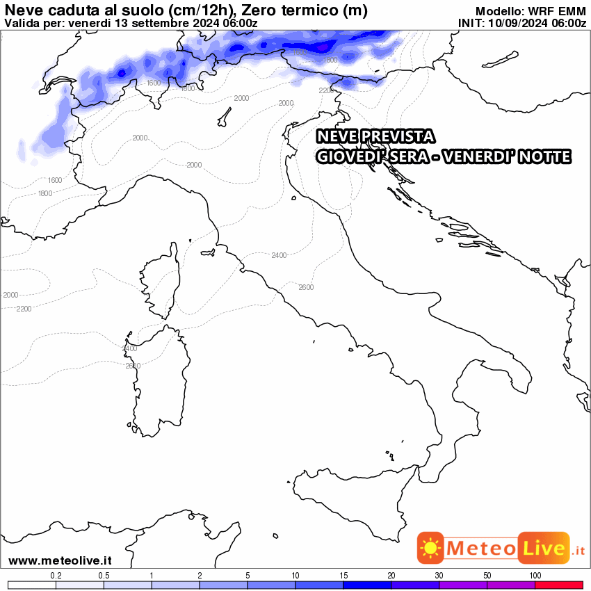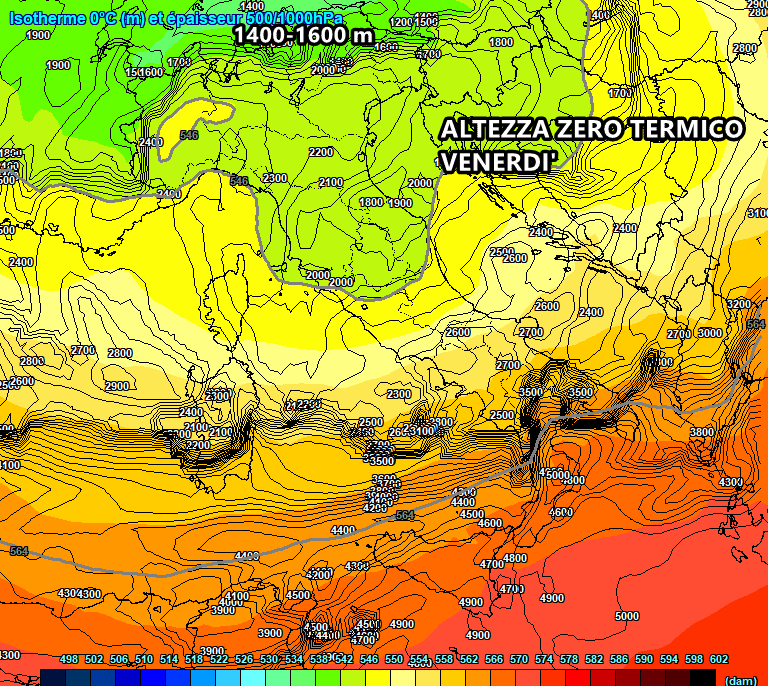 Questo poderoso calo delle temperature, che sarà realtà tra giovedì e sabato, favorirà anche un sensibile calo dello zero termico. Tra giovedì e venerdì giungeranno isoterme vicine allo zero a 1500 metri di quota, vale a dire temperature tardo autunnali che ovviamente permetteranno un drastico calo della quota neve.