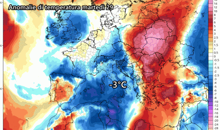 Di seguito, possiamo analizzare le anomalie previste per martedì, quando l’intera Italia si allontanerà dal caldo subtropicale, con temperature fino a 3°C al di sotto della norma, in particolare sulle regioni del centro e del Sud.