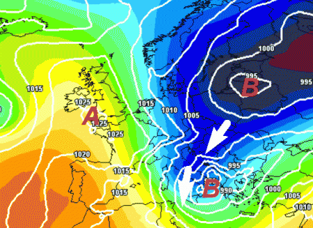 Un fronte freddo in discesa da nord formerà una bassa pressione nei pressi dello Ionio. Le isobare strettissime indicano la presenza di venti forti, addirittura di tempesta su diverse regioni del centro e del meridione. Il vento sarà presente anche sul resto d’Italia ed accompagnerà un generale calo delle temperature.