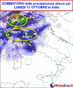 Le previsioni, purtroppo, non sono buone in quanto tra la serata odierna, la notte e la giornata di lunedì è atteso il transito di una nuova ed intensa perturbazione, che farà sentire i suoi effetti segnatamente al centro-nord. La cartina a fianco riportata inquadra la sommatoria delle precipitazioni che cadranno in Italia tra le 8 e le 20 di lunedì 13 ottobre.