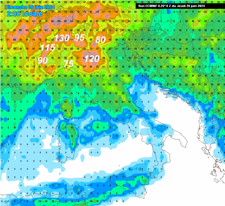 L’elaborato nostrano pone 130 mm tra alto Piemonte e alta Lombardia, 120 mm sull’Emilia Romagna, 115 mm sulla Val d’Aosta, 90 mm sulle Alpi occidentali, tra gli 80 ed i 95 mm sulla fascia prealpina centrale ed orientale.