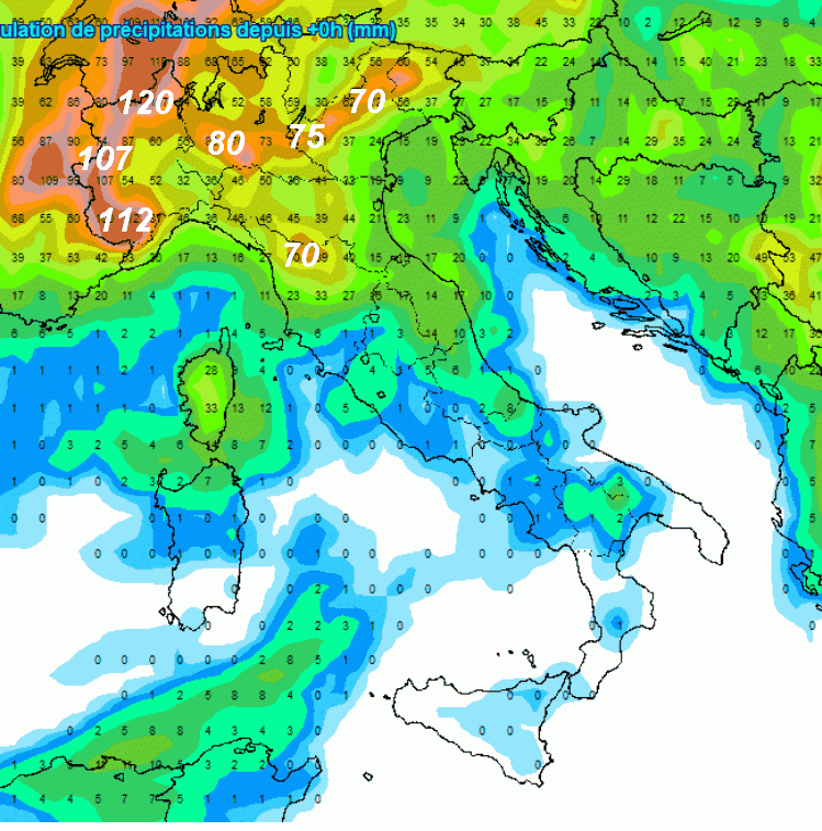 120 mm sono attesi tra la Val d’Aosta e l’alto Piemonte, 112 mm sulle Alpi Marittime, 107 mm sulle Alpi occidentali, tra i 70 e gli 80 mm sulla fascia prealpina centrale ed orientale fino ai 70 mm dell’Appennino settentrionale. Pioverà in parte anche nelle aree interne del centro, quasi affatto invece sulle altre zone dell’Italia centro-meridionale.