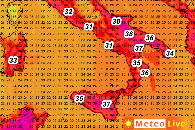 A soffrire maggiormente il caldo saranno il Molise, la Puglia, la Lucania, la Calabria Ionica e la Sicilia dove avremo temperature diffusamente sopra i 35°, con punte di 37-38°.