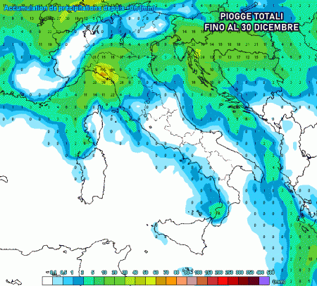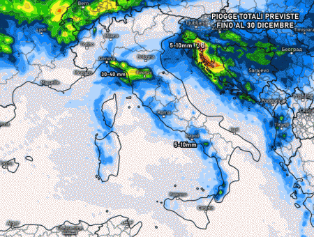 I fenomeni saranno più presenti tra 28 e 30 dicembre e saranno più insistenti a ridosso dei monti grazie al fenomeno dello stau. Proprio per questo motivo potremmo imbatterci in accumuli di pioggia totali superiori ai 40-50 mm su Liguria orientale e alta Toscana, altrove non oltre i 10-15 mm. Più asciutto sul resto d’Italia, dove potrebbe non piovere per nulla fino al termine dell’anno.