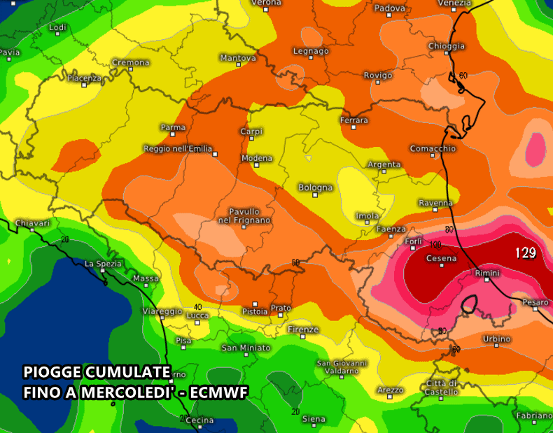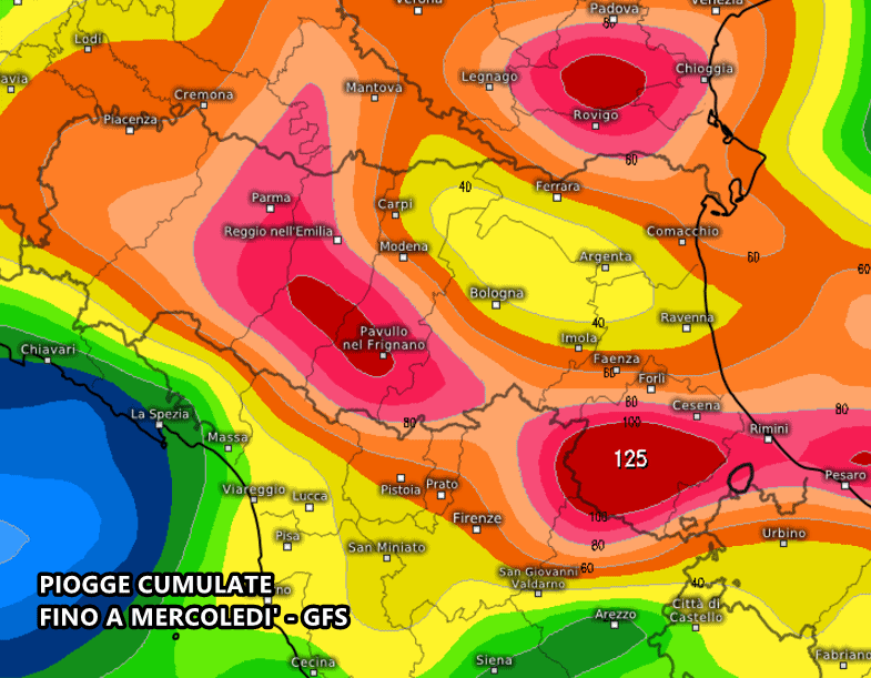Le aree più colpite saranno Calabria tirrenica, Campania, Emilia Romagna e basso Veneto. Gli accumuli pluviometrici più abbondanti sono previsti sulla Romagna, dove entro mercoledì potrebbero precipitare oltre 120 mm di pioggia. Si tratta di accumuli indicativi, che rischiano di rivelarsi molto maggiori a ridosso dell’Appennino per l’effetto stau. Accumuli così abbondanti potrebbero sfociare in situazioni di forte maltempo e disagio idro-geologico, ragion per cui occorrerà monitorare costantemente la situazione e affidarsi eventualmente alle allerte meteo emanate dalla Protezione Civile.