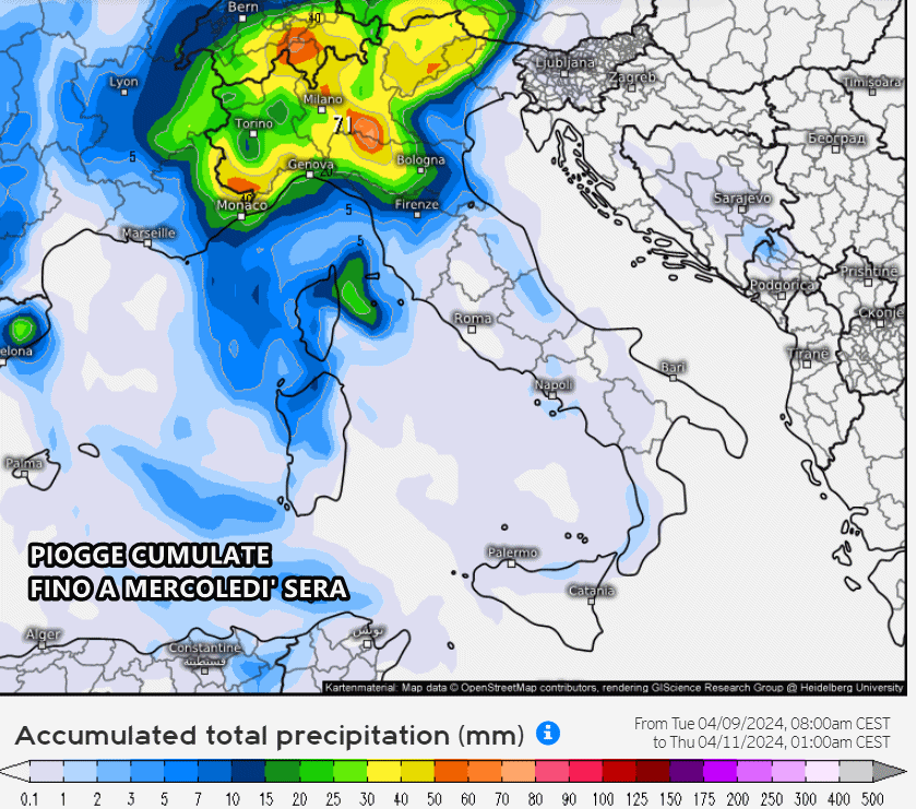 In particolare sarà il fronte occluso il responsabile delle piogge tra questa sera e la giornata di mercoledì su gran parte del Nord Italia, ma soprattutto su Piemonte e Lombardia. Avremo precipitazioni abbastanza corpose e localmente abbondanti a ridosso dei Monti piemontesi, dove ci aspettiamo accumuli totali superiori ai 50 o 60 mm.