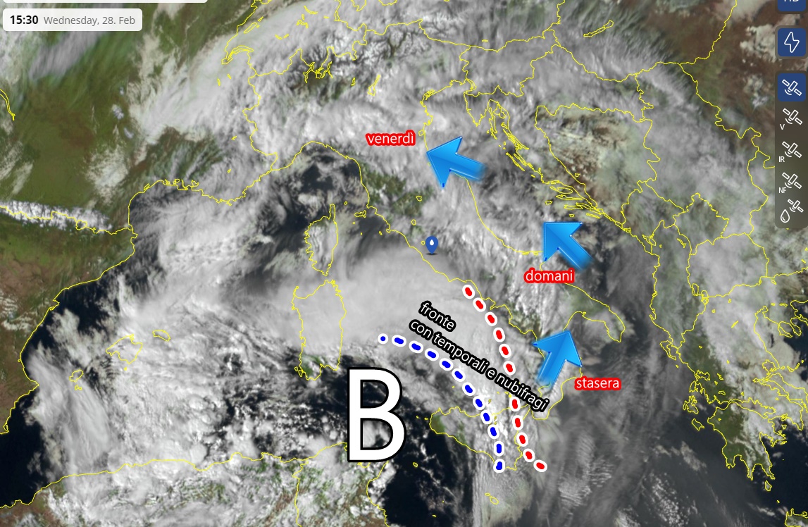 Tale fronte, indicato anche nell’immagine satellitare di seguito, si muoverà lentamente verso nord risalendo tutto il Meridione nel corso delle prossime ore.