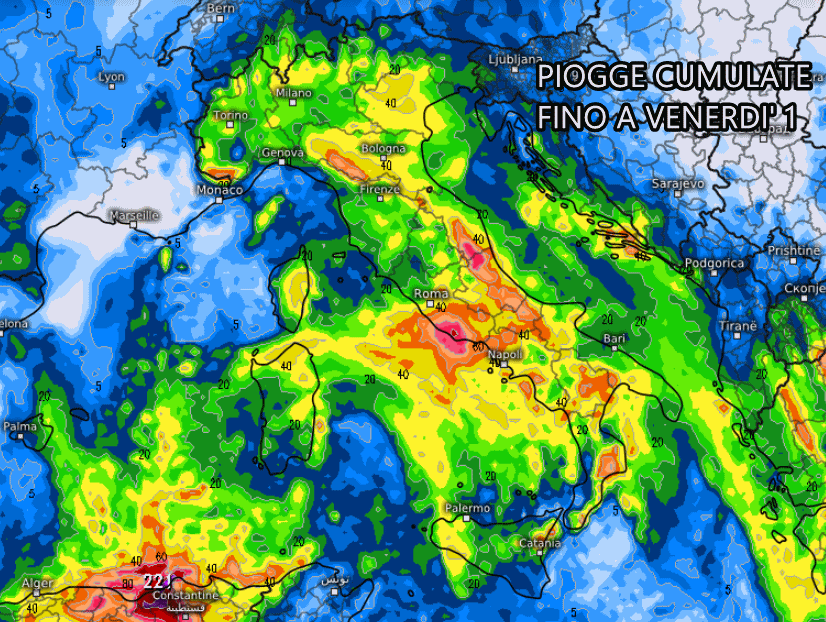Non a caso entro venerdì potrebbe piovere su quasi tutto il territorio nazionale grazie alla risalita di questo ciclone verso nord. I settori ionici della Calabria, la Basilicata, Puglia ionica, Lazio, Molise, Abruzzo e Marche potrebbero ricevere improvvisi nubifragi con accumuli elevati in brevi intervalli di tempo.