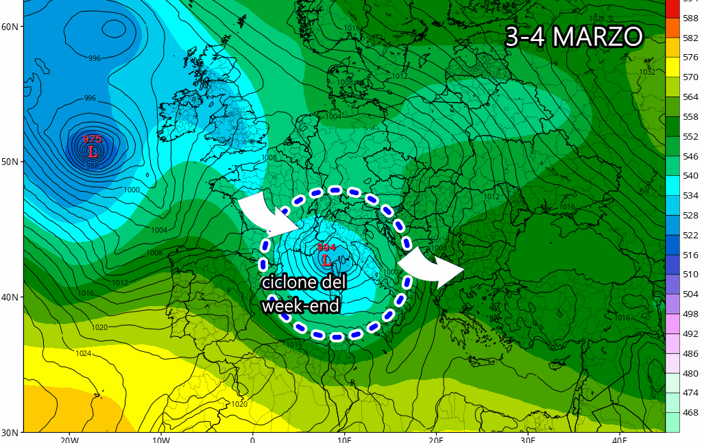 Una massa d’aria più fredda nord-atlantica scivolerà a breve su Francia e Mediterraneo, andando ad approfondire un ciclone tra la costa Azzurra e il mar Ligure. Questo ciclone, con un minimo di pressione vicino ai 995 hpa, determinerà un peggioramento importante su tutto il nord ed il lato tirrenico.