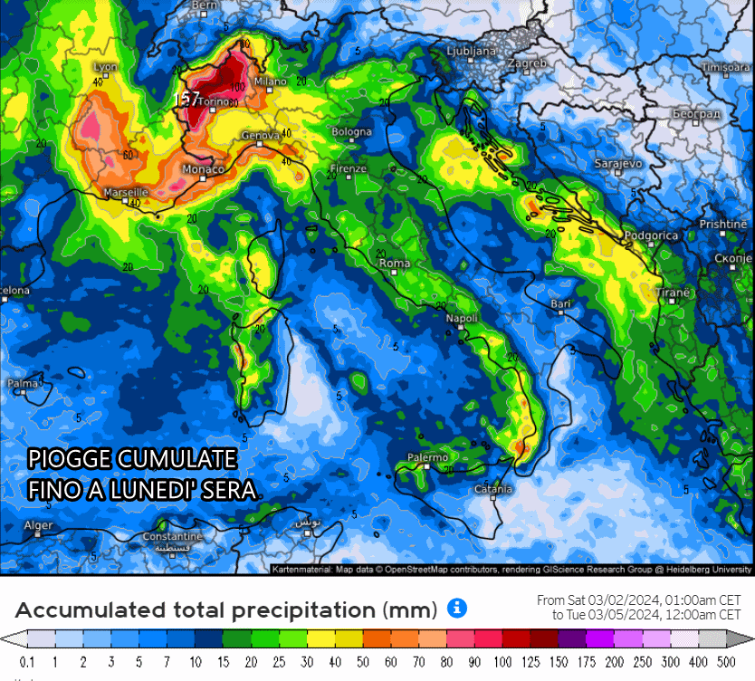 Insomma sarà il Nordovest il settore più colpito da piogge, nevicate e potenziali nubifragi. Domenica sarà la giornata più perturbata con piogge diffuse e forti, tanto che potrebbero precipitare oltre 150-200 mm a ridosso dei monti tra Piemonte e Valle d’Aosta. Piogge diffuse e localmente forti anche in Liguria e Lombardia. Pian piano le piogge si estenderanno al Nordest e le regioni tirreniche. Le forti precipitazioni previste sul Nord-ovest potrebbero causare dei disagi e ingrossamenti dei corsi d’acqua.