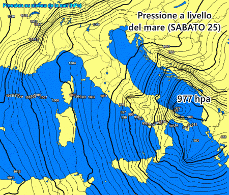 Eccolo qui, nella mappa di seguito, il minimo di bassa pressione che potrebbe approfondirsi rapidamente sul basso Adriatico, alimentato dalle fredde correnti balcaniche. È chiaro che si tratta solo di una ipotesi al momento, pertanto possiamo considerare questo minimo barico di 977 hpa come il valore più estremo previsto al momento.