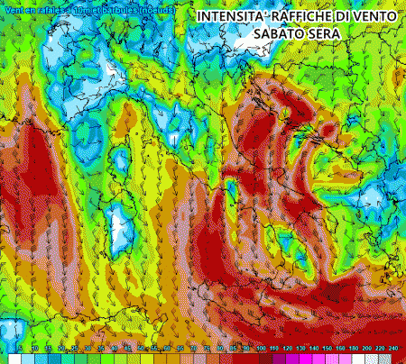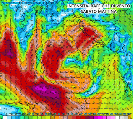 Questo ciclone molto profondo potrebbe innescare violente raffiche di vento a carattere ciclonico. Sabato mattina la bora sferzerebbe tutto il centro Italia, mentre il maestrale soffierebbe in Sardegna con raffiche anche oltre i 90 km/h.