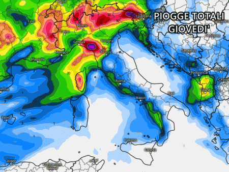 Una vasta depressione atlantica si dirigerà verso l’Europa occidentale dove si approfondirà ulteriormente, tanto da raggiungere un minimo barico di ben 960 hPa. Attorno a questo vortice di bassa pressione si muoveranno vasti impulsi instabili provenienti da ovest che raggiungeranno facilmente l’Italia, accompagnati da fortissime raffiche di vento di libeccio. Questi venti interesseranno principalmente il centro e il sud, dove si prevedono raffiche ben oltre gli 80 o 90 km/h tra giovedì sera e venerdì mattina. Inoltre, questi stessi venti alimenteranno forti temporali responsabili di piogge sostenute e nubifragi persistenti tra la Liguria e la Toscana, nonché sull’Appennino Emiliano e sulle Alpi centro-orientali.