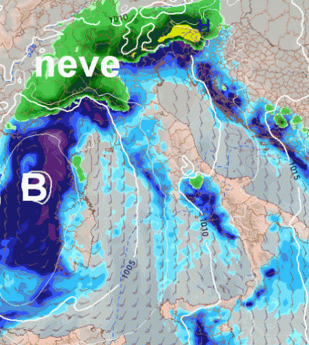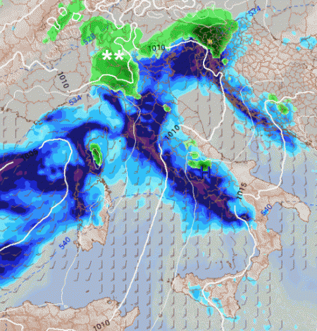 Ecco la sequenza delle precipitazioni in arrivo rispettivamente per il pomeriggio di Capodanno, la notte su sabato 2 e la successiva mattinata, notate in verde come la neve tenda ad abbracciare gradualmente nell’ordine Emilia occidentale, Lombardia, settore alpino centro orientale sino alla pedemontana veneta e poi l’Appenino ligure e soprattutto il Piemonte, che sarà la zona dove poi la neve stabilirà il suo quartier generale, perchè altrove al suolo le temperature, sotto la spinta del flusso sciroccale, salirano troppo per favorire la caduta di altra neve sino in pianura, forti piogge sono attese tra l’altro sul Tirreno:
