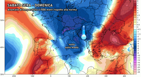 Anomalie di temperatura davvero notevoli tra sabato sera e domenica. Si prospettano picchi di almeno 7-9°C sotto le medie del periodo al centro e poi al sud.