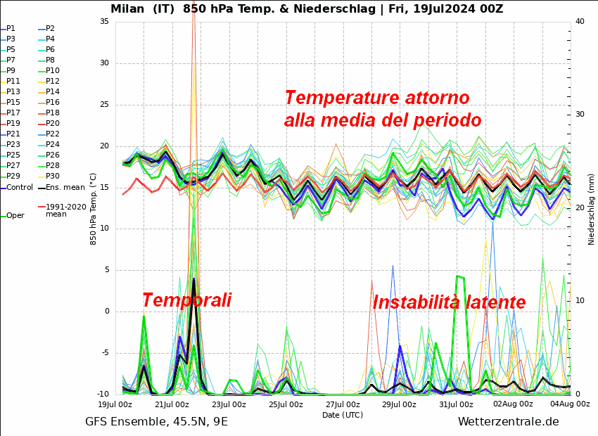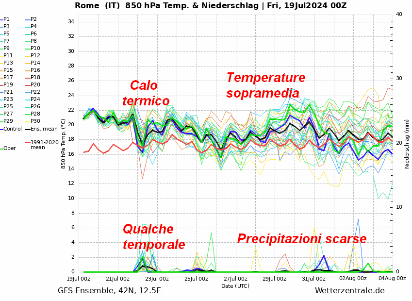 Il mese di luglio ci riserverà altre ondate bollenti o vivremo un periodo più gradevole con episodi temporaleschi? Per avere risposte più attendibili interpelliamo un diagramma completo che tenga conto non solo del run ufficiale del modello americano, ma anche delle cosiddette “corse alternative” che il modello medesimo periodicamente ci propone.