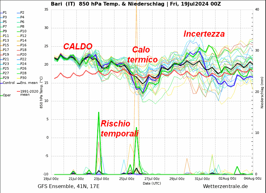 Quelli che vedete sono chiamati SPAGHETTI e riassumono tutte le corse del modello, compresa ovviamente quella ufficiale. La corsa ufficiale è rappresentata dalla linea verde. Le linee a metà grafico sono le temperature a 1500 metri di quota e la linea rossa è la media. I picchi che si notano più in basso sono invece le precipitazioni. Più i valori sono alti, più le piogge (o le nevicate) sono probabili e intense. I punti geografici di riferimento sono situati sulla verticale delle città di MILANO, ROMA e BARI.