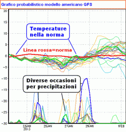 E gennaio 2013? Prima e dopo l’anomala fase mite intorno all’Epifania, la stagione si è comportata analogamente al resto di dicembre senza discostarsi granchè dalla media di riferimento. Secondo le proiezioni probabilistiche del modello americano Global Forecast Sistem tale andamento si confermerà sin quasi alla fine del mese (grafico qui a fianco). Detto in altre parole: quando le temperature si mantengono prossime alla media di riferimento (solitamente calcolata sugli ultimi 30 anni) e quando le precipitazioni si manifestano con sufficiente frequenza, la stagione è da considerarsi nella norma. Nevica poco in pianura? Signori, in Italia anche questo è la norma.