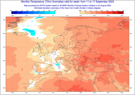 Come potrebbe comportarsi la prima parte di settembre in Italia? Lo abbiamo chiesto al prestigioso centro di calcolo ECMWF che oggi ha aggiornato le proiezioni a lungo termine. Vi ricordiamo che tali mappe e le previsioni indicate, pur avendo una validità scientifica poichè effettivamente elaborate da potenti computer che eseguono miliardi di calcoli fisico-matematici basati anche su statistiche climatologiche, si intendono proposte per curiosità e principalmente come "esercizio didattico"si ritiene non siano di utilità per programmare attività.