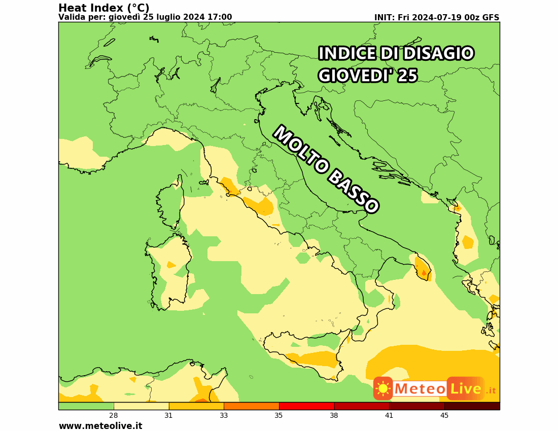 Non a caso l’indice di disagio previsto per giovedì è molto basso su quasi tutto lo Stivale, segno dell’avvenuto ricambio d’aria: