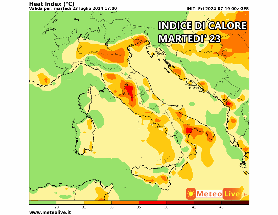Tralasciando i temporali che, per il momento, resteranno un fenomeno estemporaneo, l caldo e soprattutto l’afa resteranno a spasso per l’Italia, come si evince dall’indice di disagio previsto martedì 23. Insomma ci sarà solo una lieve attenuazione del gran caldo presente in queste ore.