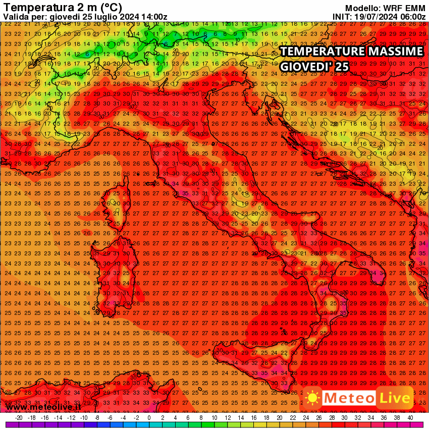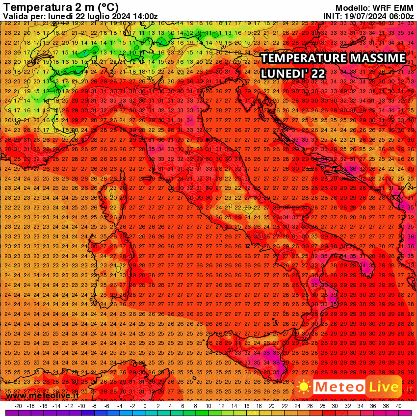 In effetti osservando le temperature previste lunedì 22 luglio, possiamo notare la persistenza del caldo su gran parte d’Italia, eccetto i settori dove saranno in atto temporali e rovesci (ad esempio sull’Appennino centrale, la Campania, la Puglia centrale e l’entroterra della Basilicata. Un congruo calo termico è previsto solo in Sardegna.