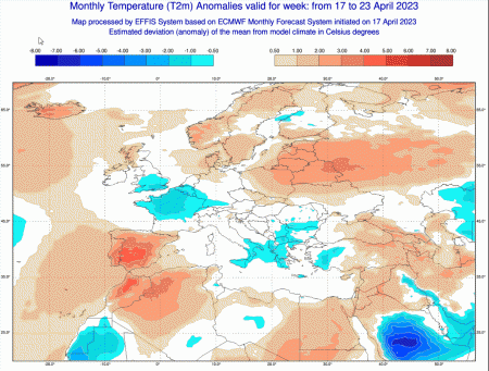Iniziamo dalle anomalie termiche: la prima mappa ce le mostra fino al 23 aprile: