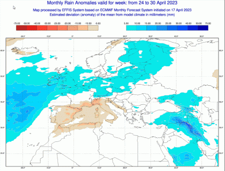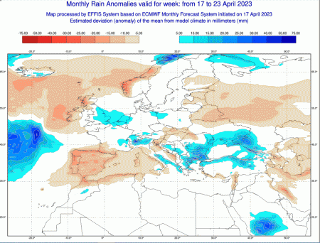Queste invece sono le anomalie precipitative attese in Italia fino a domenica prossima (23 aprile):