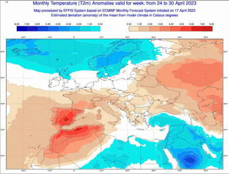 Veniamo ora all’ultima settimana di aprile, tra lunedi 24 a domenica 30 aprile. Queste sono le anomalie di temperatura previste: