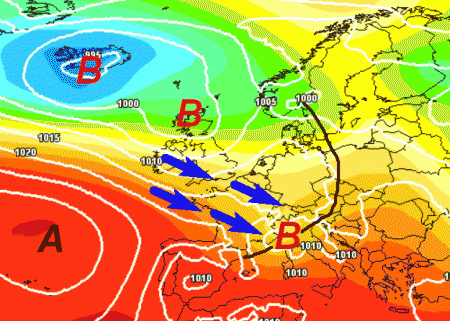 Ecco la perturbazione adagiata al settentrione che formerà un minimo barico in corrispondenza del Mar Ligure. E’ seguita da aria decisamente più fresca che farà abbassare le temperature sul nostro Paese nell’arco del fine settimana.