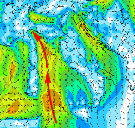 Previsione dei venti al suolo nella mattinata di lunedì, con Scirocco attivo lungo il versante tirrenico, dove il tempo sarà instabile: