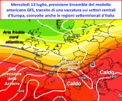 Dalla analisi del modello americano GFS, sia nella previsione deterministica, sia nella media Ensemble degli altri 20 scenari estrapolati, viene ormai confermato l’avvento di un passaggio instabile/perturbato diretto nel periodo compreso tra martedì 12 e venerdì 15 luglio, alle nostre regioni settentrionali. Quest’ultimo altro non sarebbe che una saccatura, cioè una circolazione ciclonica organizzata, munita di fronte caldo e di fronte freddo in rapida evoluzione dai settori occidentali a quelli centrali d’Europa.